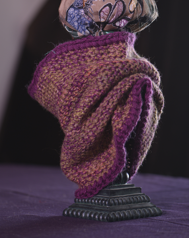 From Italy we have this beautiful lavender alpaca boucle` yarn that has a little bit of merino in it for strength. The texture that results from these boucle` yarns is really something and because of the skilled spinning the alpaca is able to show off its softness. In alternating rows is a handspun, handpainted merino yarn from South America that is equally as soft and beautiful. Both of these yarns are the right softness for wearing next to the delicate skin of the neck and they'll give you lots of years of warmth and durability.